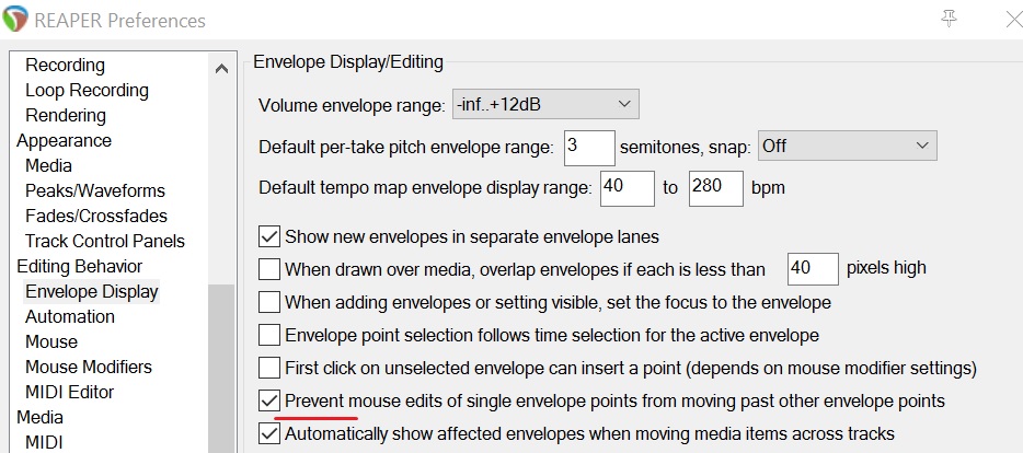 Было, и это экшен Options: Prevent mouse edits of single envelope points from moving past other envelope points , но он не работает почему то, когда выделено несколько точек. На мой взгляд, это ошибка.