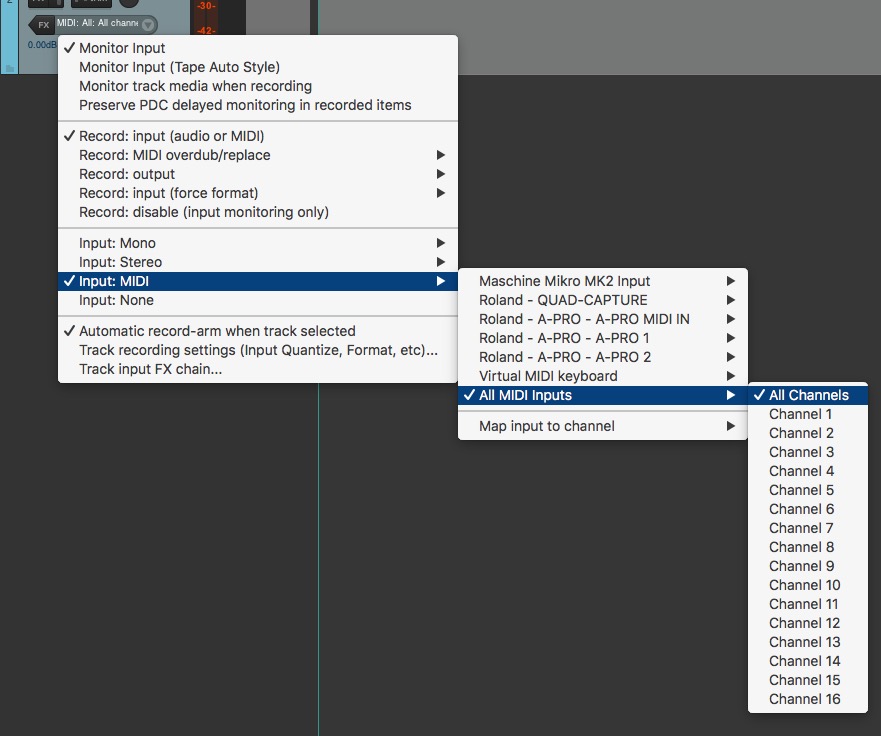 @AlexLazer, чуть выше на вашем скриншоте: "Record: input (audio or MIDI)" - если я включаю этот пункт, то запись вообще прекращается. Единственное, как может записывать, - это в wav.