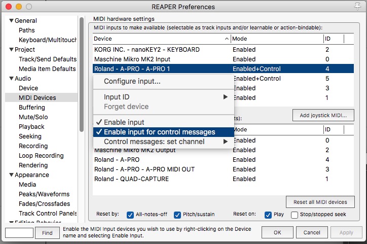 @nikolas_n, У девайсов миди должен быть включен еще и контрол, чтобы работали фейдеры и нобы, ну и чтобы они назначались. У меня тоже Роланд, все работает. Правый клик и там Enable for control