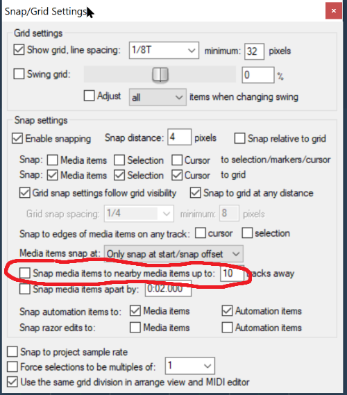 А нету случайно для опции: Media Item snap at: snap both start / end ?