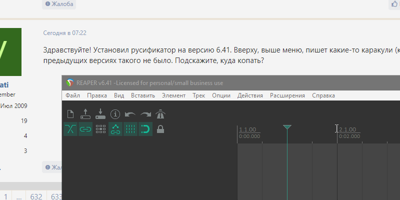 Не регистрировал. Скачивал всё с оф. сайта. Кажется, я понял свою ошибку. Установил русификатор со старой версии. Потом скачал более новый и установил поверх. Сейчас удалил, поставил заново. Теперь написано REAPER v6.41 -EVALUATION LICENSE. А были каракули неправильной кодировки, когда русский выставлен. Если английский - то нормально было. Спасибо!