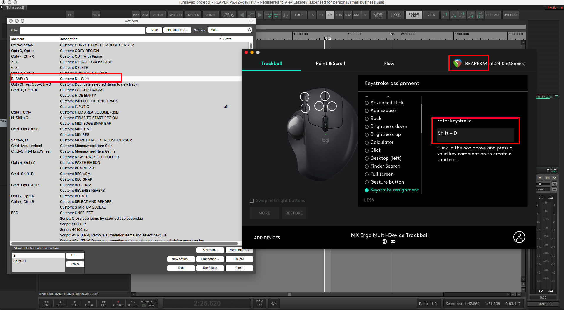 По прогам у меня так - выбираешь приложение и в keystroke assignment назначаешь шоткат из Рипера например. Думаю у тебя так же.