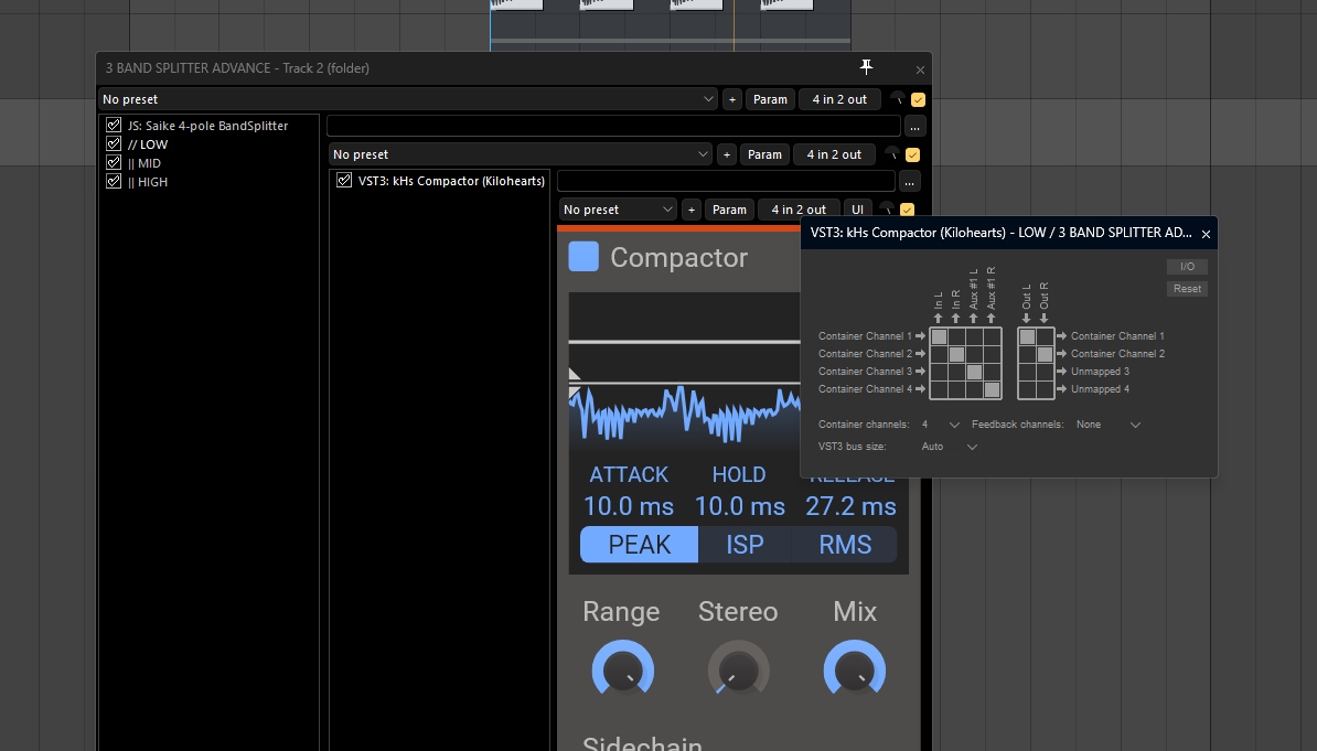 Сплиттер делит сигнал на саб, мид и высокие, которые я хочу сайдчейном жать в разной степени с помощью компактора.А сплиттер тут зачем? Остальные плагины же параллельно работают.