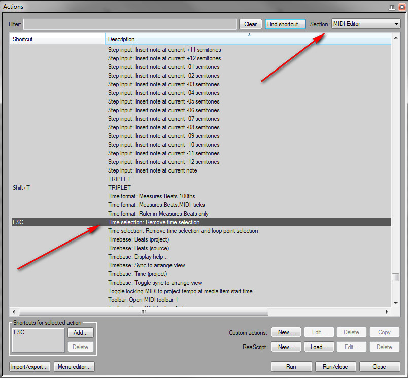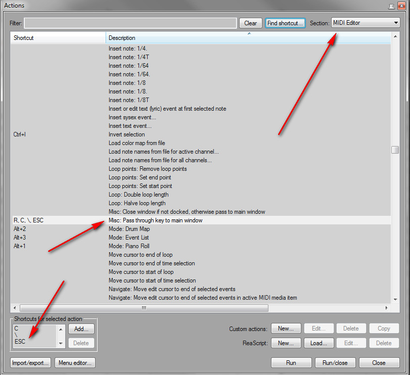 [DOUBLEPOST=1439679995,1439676358][/DOUBLEPOST]Или же поставьте шоткат "esc" в миди эдиторе на команду Misc: Pass through kew to main window