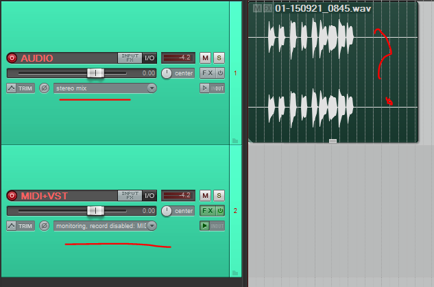 Делаем два трэка: на первом играет VST, отдаёт звук на второй трек (галка посыла на мастер снята), который пишет уже аудио. Простейшая ситуёвина. Всё нормально работает, пока не нажмёшь Arm на втором, аудио треке. Индикаторы по нулям, но звук продолжает идти! Чё за навиг??? Как он идёт, если на индикаторах ничего нет??? Если запустить запить, то пишуться обе дорожки: и МИДИ, и аудио, на которой ничего нет, хотя звук идёт. Ну где логика? Как заставить его писать аудио и НЕ писать МИДИ?