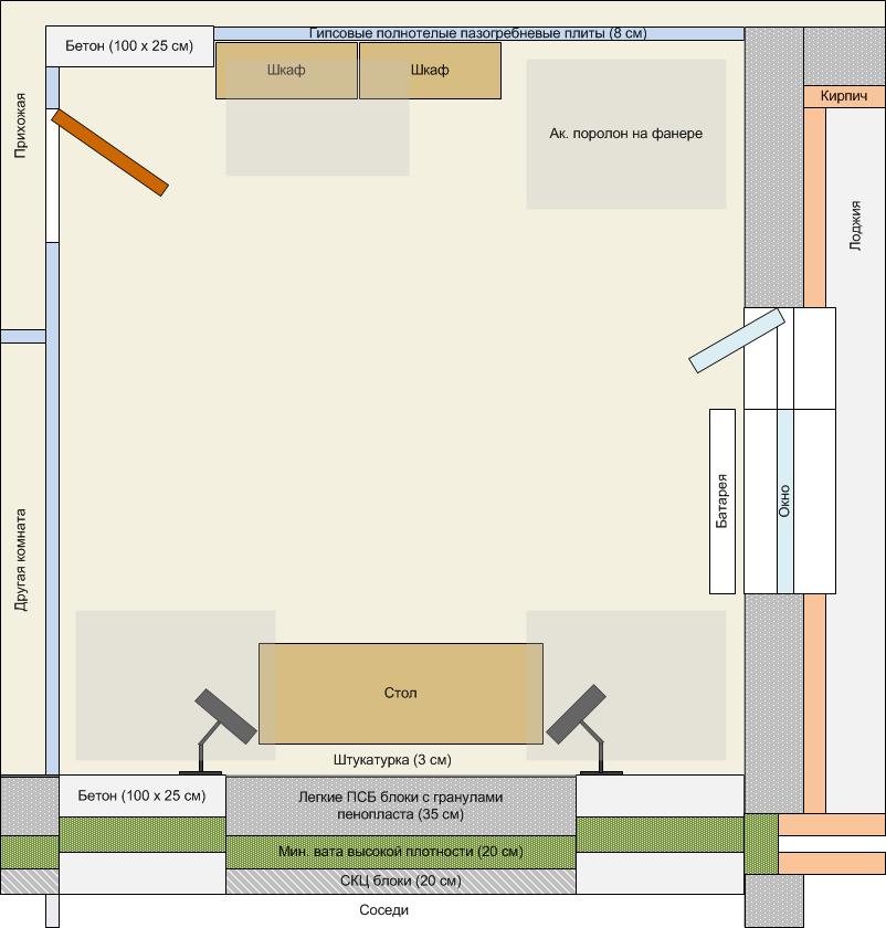 Комната от всех соседей по периметру достаточно изолирована, кроме бетонного потолка. На полу древесная подложка с линолеумом. В углах комнаты на расстоянии 10 см от потолка подвешены фанеры по 1,5 кв. м. с акустическим поролоном 30 мм. Еще на стенах висит столько же поролона 70 мм. Эха нет. Но с низами не все гладко в углах, хотя в центре проблем не заметно. При записи голоса что-то мешает. По расчетам acoustic на низах большое время реверберации. Точность расчетов низкая из-за отсутствия данных по всем видам материалов стен. Тем не менее, нужны, как я понял, более плотные материалы в отделке, но уменьшать комнату по площади не хочется. Планирую сделать подвесной потолок из фанеры или другого древесного материала с отступом от потолка 10 см и мин. ватой за ним. Возможно, еще углы слева забью (те, что не из ПСБ) или стену, противоположную мониторам…
