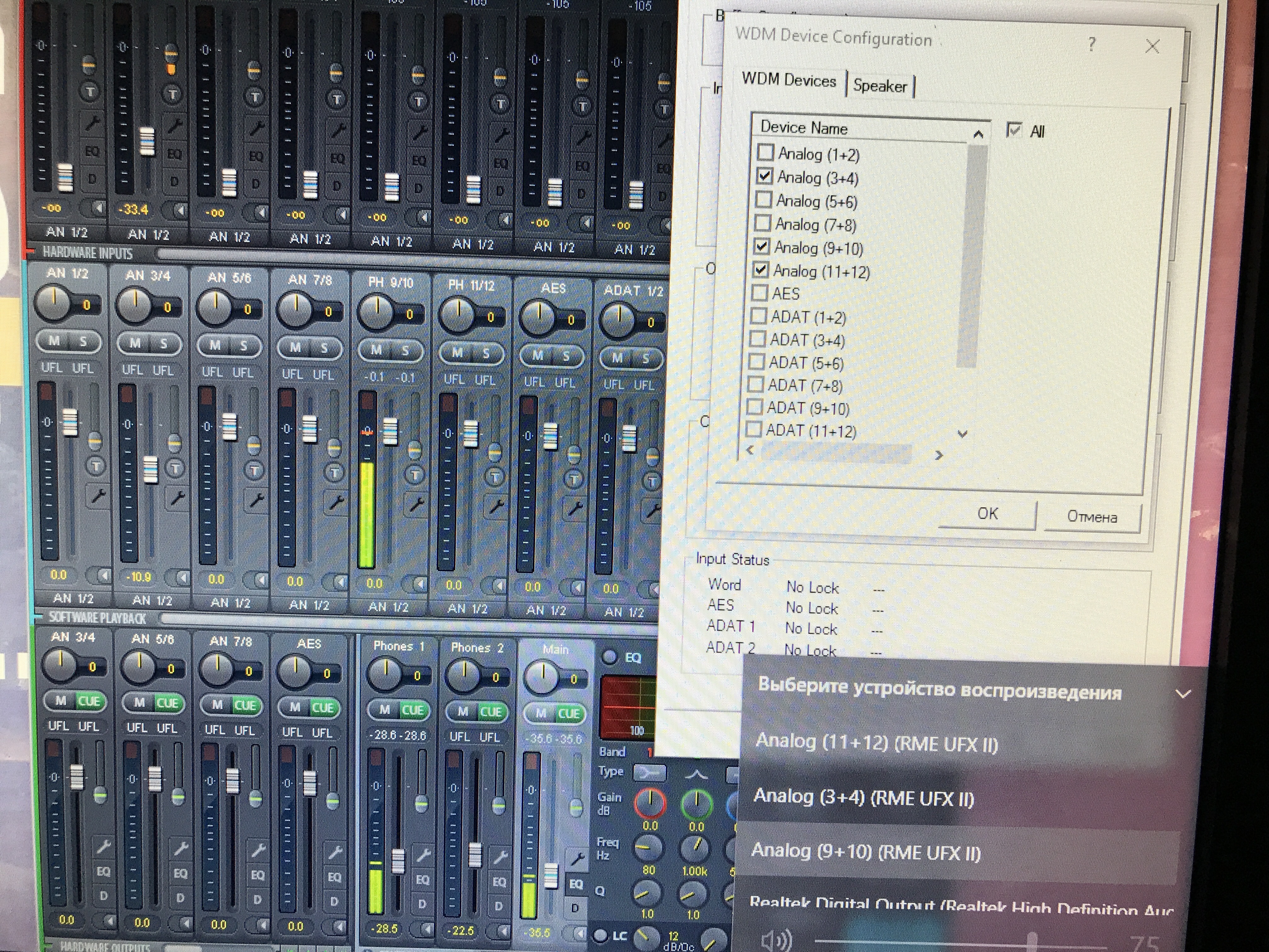 Но получается так, к примеру, у меня сейчас подключены мониторы на аналоговые какналы 3/4, и двое наушников 9/10 и 11/12. Все это дело включено в MADIface Settings, если выбирать отдельно устройство воспроизведения/ канал, включаем аудиофайл для прослушивания, то работает то, что мы выбрали. Но если заходить в софт и выбирать ASIO MADIfireface, то работает только канал 1/2 независимо от всего остального.