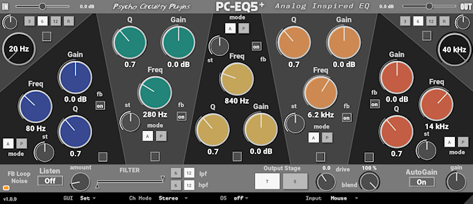 5 band analog inspired EQ. High and Low shelves, 3 bell filters. All switchable between Active or Passive inspired filter shapes. Adjustable Q, frequency and gain. High pass and low pass filters with 3, 6, 12, and resonant 12 selections. Per band stereo separation control. Per band Feedback Loop distortion send. Feedback distortion section that simulates active eq nonlinearities, with hpf/lpf to shape into your sound. Output stage with Tube or Solid state models, drive and blend control. Auto Gain with additional adjustment. Up to x16 oversampling, stereo or mono operation.