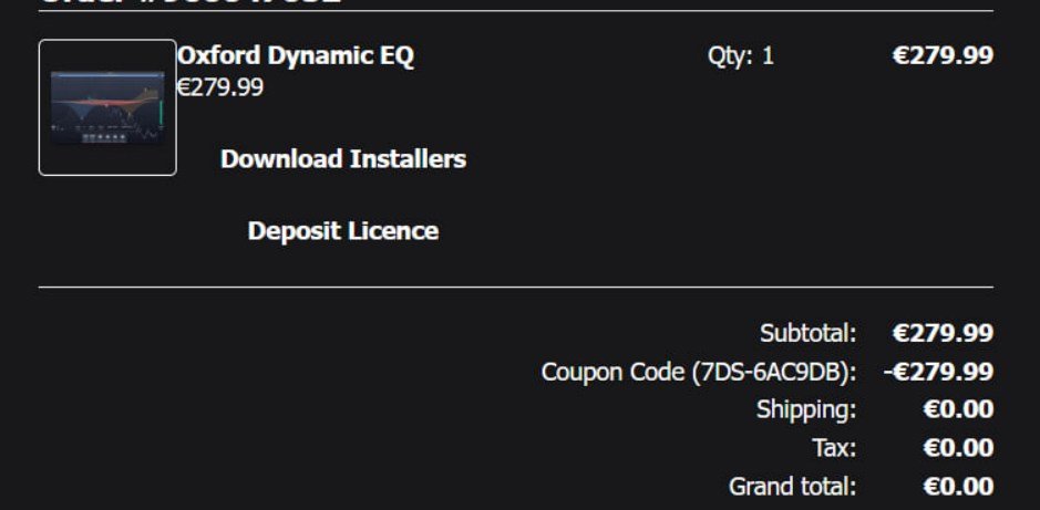 Выпал купон на фри плагин. Выбрал к примеру Oxford Dynamic EQ за 280уе, ввел код и вуаля, покупка обнулилась. Правда местный адрес не хотел принимать, пришлось выдумывать.