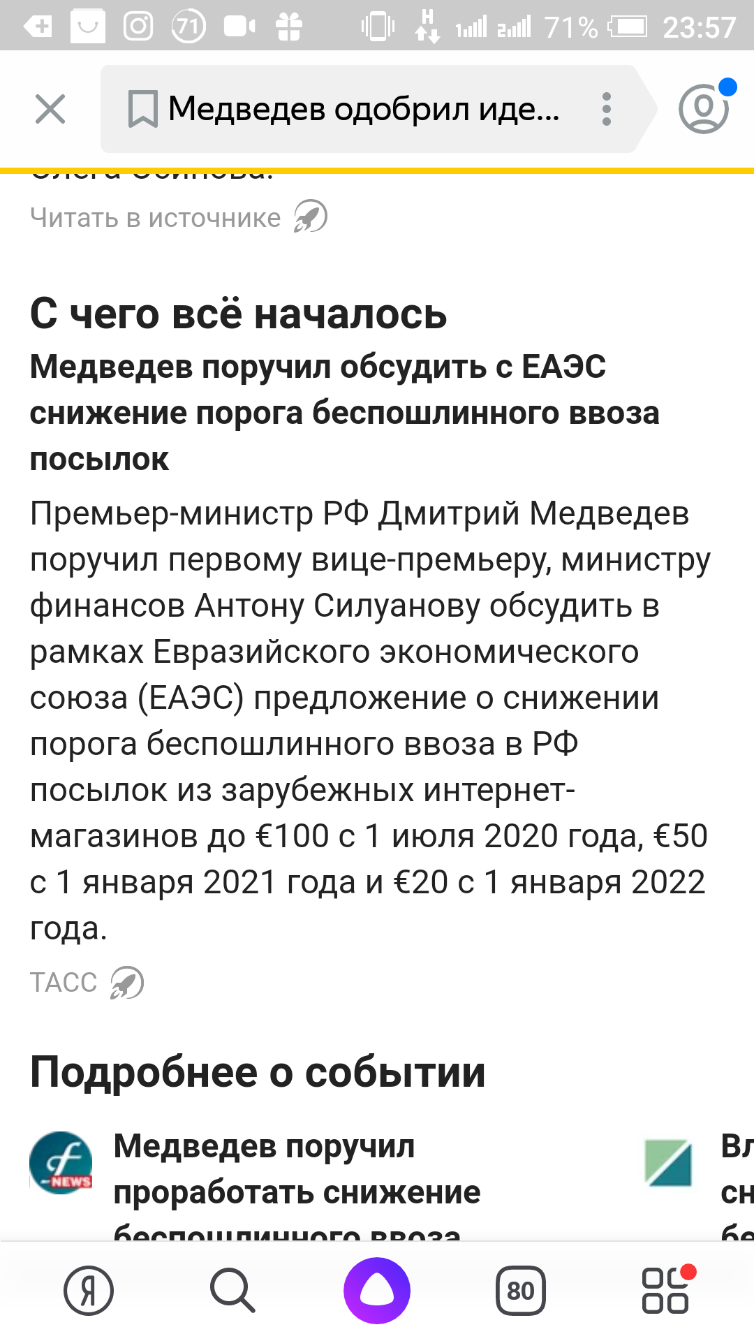 Премьер-министр РФ Дмитрий Медведев поручил первому вице-премьеру, министру финансов Антону Силуанову обсудить в рамках Евразийского экономического союза (ЕАЭС) предложение о снижении порога беспошлинного ввоза в РФ посылок из зарубежных интернет-магазинов до €100 с 1 июля 2020 года, €50 с 1 января 2021 года и €20 с 1 января 2022 года.