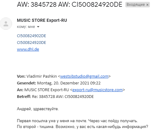 Я когда-то у них брал Arturia Audiofuse и возвращал по причине хреновой работы драйверов и довольно сильного сугрева корпуса карты. Путь карты от них до меня был довольно быстрым - 2 недели где-то вроде как, не помню уже точно. А вот обратно получилось не так гладко, притом, как ни странно, не по вине Почты России, что удивительно. На обратном пути карты в Music Store российская часть маршрута оказалась очень короткой, буквально 3 дня, т.е. почта России моментально практически переправила карту в Германию, что для меня было сюрпризом. Однако, собственно по самой Германии карта каталась чёрти знает как. Во-первых, долго не было новостей по трекингу о прохождении карты через Customs (таможню), потом всё же через неделю новости эти появились, притом пачкой, т.е. таможню, судя по всему, карта-то быстро прошла, а вот в трекинге не отобразилось нифига. Во-вторых, потом началась какая-то муть в том плане, что посылка почему-то каталась из одного города в Германии в другой и так она объездила городов штук 8, почему и какого чёрта - пёс его знает. В общем, понервничал я сильно, поскольку вот эти вот немецкие путешествия посылки заняли почти полтора месяца. На звонки в саппорт Music Store сотрудники отвечали и очень мило отшучивались (хотя их можно понять, это косяк именно DHL, а не их), но ничем не помогали, в саппорте DHL точно такая же ситуация и вот это уже никуда не годится.