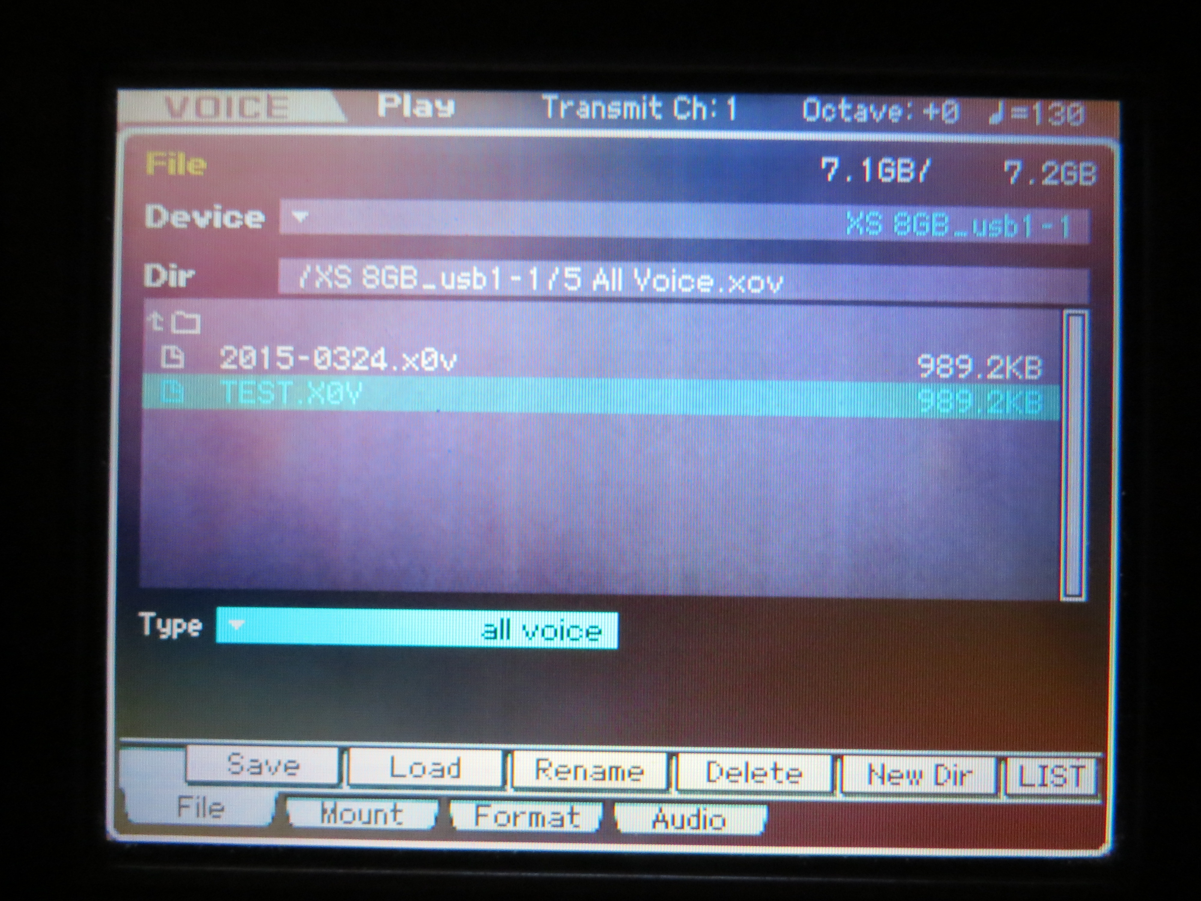 Сохранение созданного голоса - стр. 97 мануала. Сохранение файлов - стр. 278. Процедура сохранения зависит от типа сохраняемого файла и режима, в котором находится синтезатор, перед выбором меню File. Чтобы сохранить Ваш созданный Voice - после создания его нужно сохранить в синте - Store, затем, находясь в режиме Voice - перейти в меню File - выбрать тип сохраняемого файла All Voice - появится команда Save - сохранить. Чтобы затем его загрузить в синт - находясь в режиме Voice - выбрать меню File - тип Voice (.XOA .XOV) - выбрать Ваш Voice из списка, указать место, куда он будет загружен и выбрать Load. Загруженный Vioce перезапишет ранее находившийся в месте, которое Вы указали.