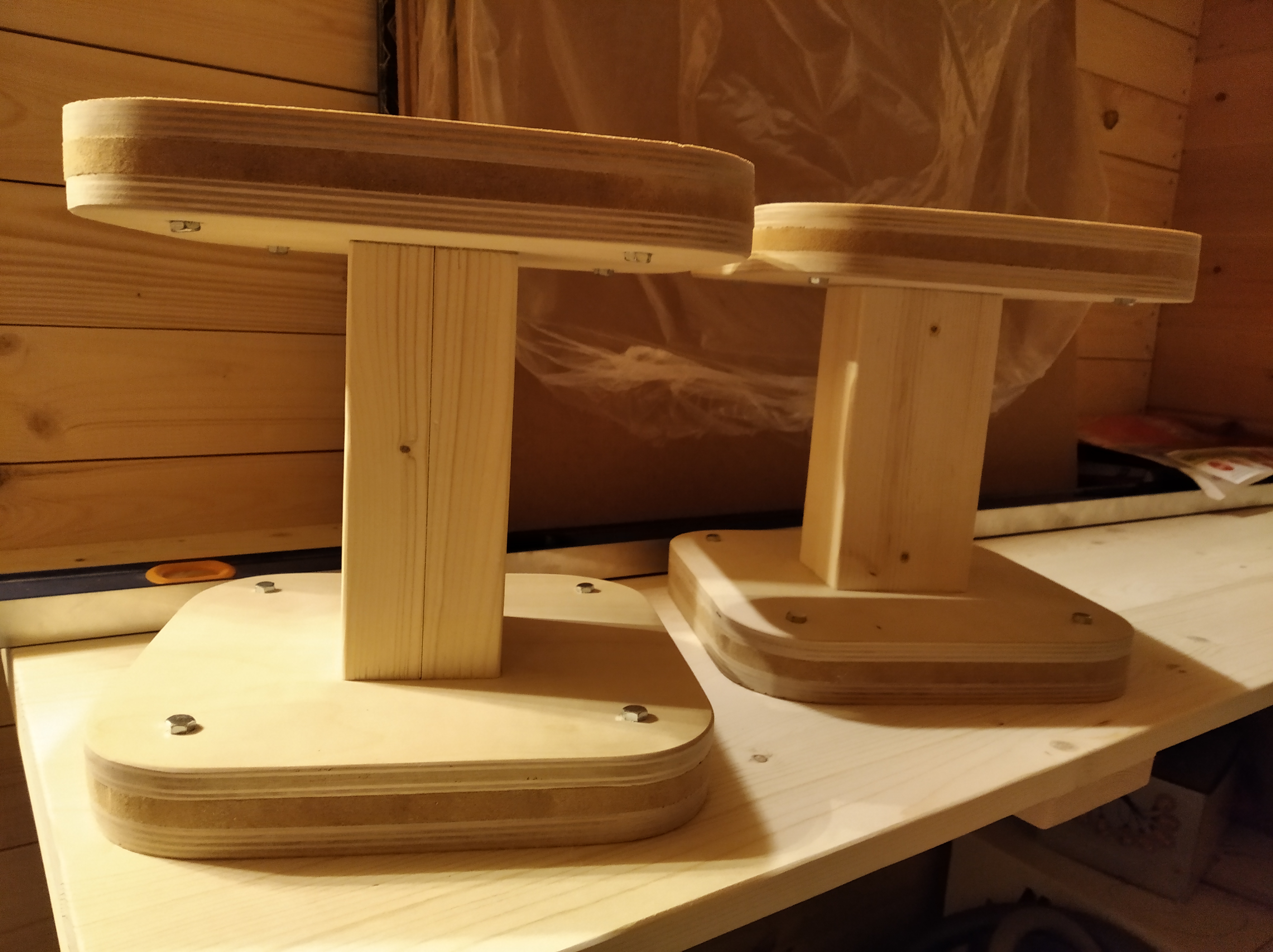 Лучше Sorbothane isolation pads приклеить на верхнюю площадку. Функционально и красиво.Купиль фанерька, хвойный шумоизоляций, сантехболтиков и конструкционных саморезаф и сваял на скорую руку стойки под акустику. Не знал куды запостить, а похвастаться ужасть хотца.
