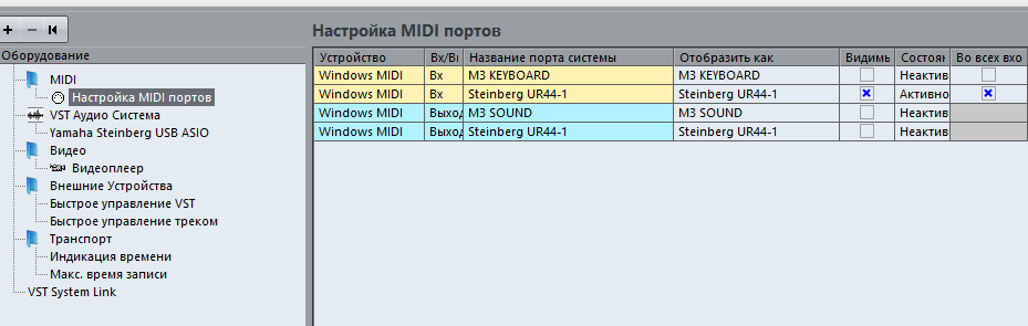Выложите скрин MIDI Port Setup в Cubase