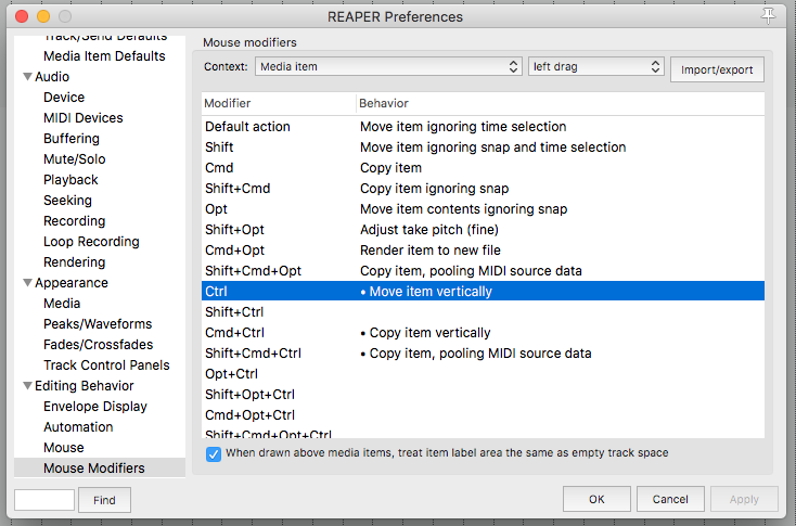 Не помню с какой версии Reaper (сейчас 6.23 МакОС) , но у меня вот такого фиксированного перемещения айтема не происходит, (уже все в маус модифаерах перепробовал) . Мышкой вверх,вниз, но только с привязкой к сетке, up-down -нет :Dle13:. Гляньте, пожалуйста ...