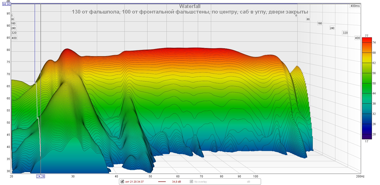 Допустим, от саба в углу идеальный по RT отклик на уровне роста (ну не до стульчиков мне при сверке на слух) получился неплохим даже по АЧХ. Не считая того, что это по факту ноль на тагненциалке, и энергетика 40-50 Гц там провалилась. То есть для РАБОТЫ это не решение.