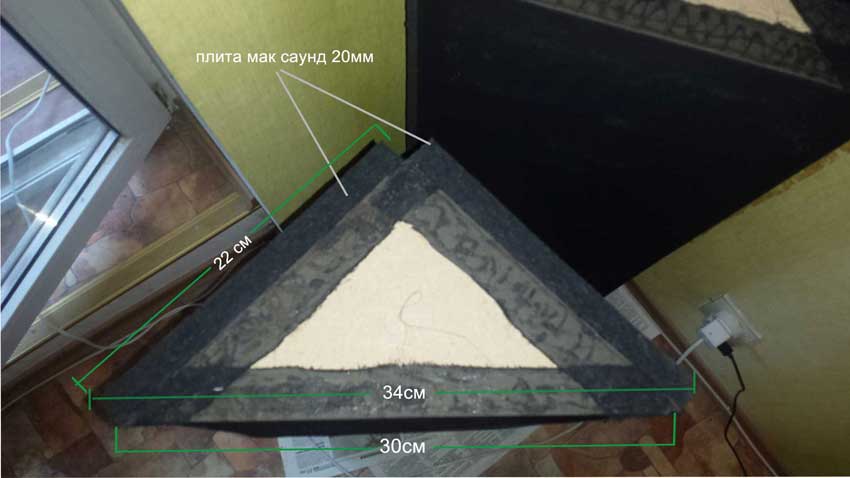 Есть бас ловушка супер чанк небольшая метр высота катеты по 22 см гипотенуза 30 см + 4 см от плит максаунд 20мм (Состоит из кусочков акустического пенополеуритана, каучука, армоткани.)