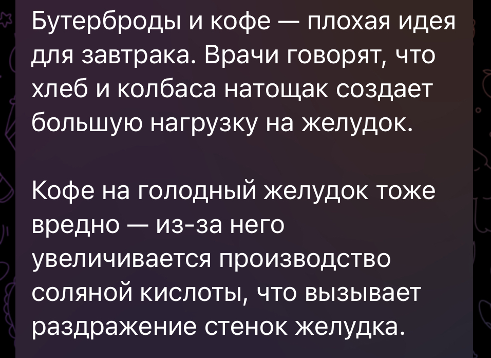 А у меня как раз на бутик с сыром конкретно изжога еб...шить начинает. Такие дела) А вот на кофе с молочком с утра - вообще всё спокойно, по этому самый вредный совет, это тот, который по методичке, я считаю.