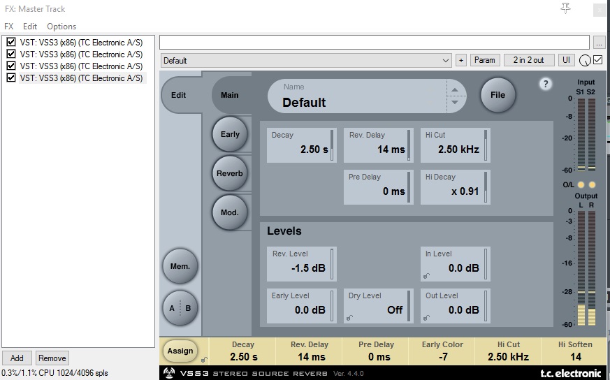 И зачем вам аж 4-е VSS3 плагина последовательно??????? Каждый из них добавит кратно задержку.