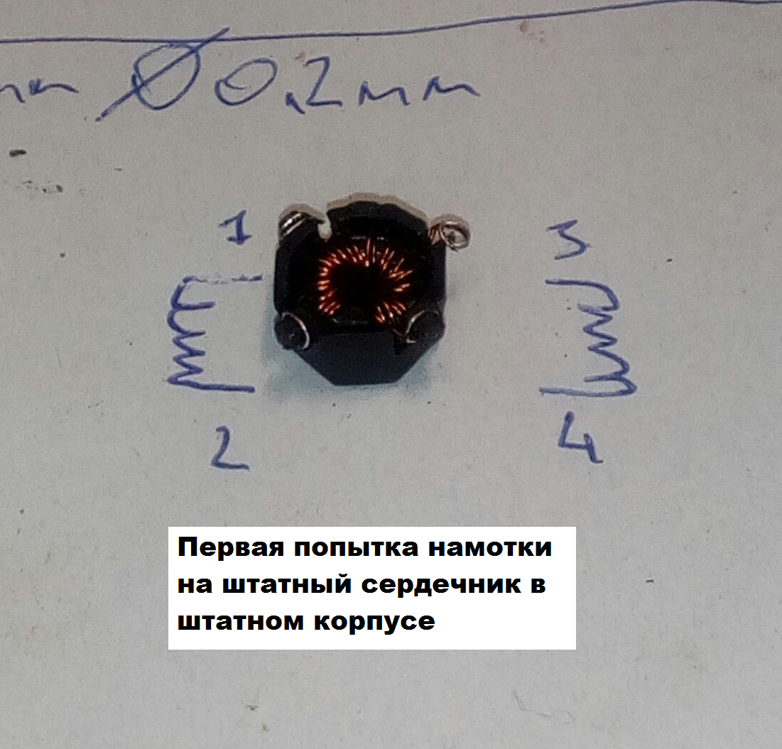 В общем решив идти до конца, посоветовался со старшими товарищами и взял у них ферритовое колечко пригодное для замены старого, его обозначение М1000НМ12 К7*4*2 (правда один в один не получилось, пришлось взять два таких и склеить суперклеем в одно (да, так можно) примерно похожее по сечению. Родное кольцо из неизвестного материала имело габариты 6,5*3*2,5 - сечение кольца увеличилось но здесь это не так важно, индуктивность же осталась примерно той же, посмотрел на осциллографе фронты на индуктивности - все норм) и намотать две обмотки по 14 витков проводом 0,25 в лаковой изоляции. Важно чтобы сечение сердечника было похоже или немного больше, сечение провода похожее или немного больше, количество витков - как на образце - 14 витков на каждой обмотке. Обмотки в отличии от штатного варианта уложил не вперемешку, а отдельно с двух сторон бублика, чтобы уменьшить вероятность замыкания между ними при нагреве (это не очень хорошо, но и не криминал). Крышку на индуктивность ставить не стал, ибо пусть охлаждается если надумает греться и габариты чуть больше стали, не хотел мять обмотки.
