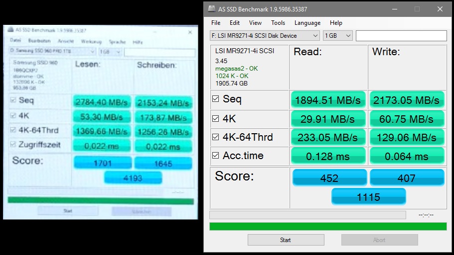 Для сравнения - слева Samsung 960 PRO 1TB NVMe, справа рейд-массив из 4-х Plextor m5 pro на LSI Megaraid 9271-4i