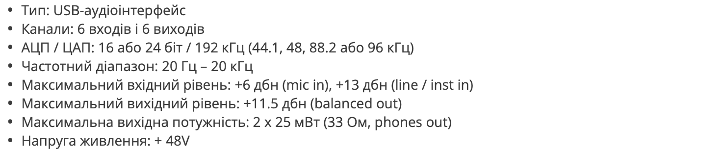 Выход на наушники имеет не очень большой запас. 25 мВт максимальной громкости по сравнению с 48 мВт в младшей модели. Мы подключили низкочувствительные наушники 32 Ом и 250 Ом, громкости было впритык, без запаса. Для сравнения, у Steinberg UR12 мощность усилителя 6 мВт на канал, вот там громкости ощутимо недостаёт.