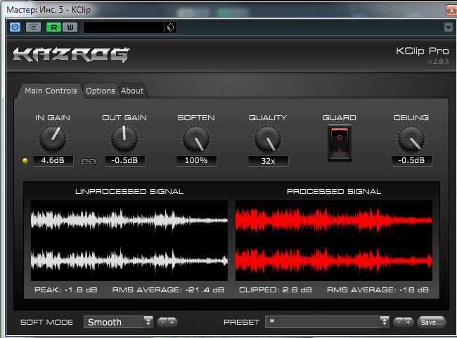 Друзья, помогите разобраться пожалуйста. Туплю наверное, но никак не могу сообразить. Сейчас Kazrog KClip Pro можно за 25 $ взять что я и сделал. Как им правильно 2\2,5 дб. обрезать перед лимитером? Можно двумя способами этого добиться... Поставить out gain на -0,5 скажем, а in gain повышать пока в строке klipped под окном процессинга не появится значение примерно в 2 дб. А можно залинковать in и out, затем повышая in (out соответственно будет понижаться) тоже добиться пару дб. среза, но в этом случае он как максимайзер работает по идее, а не тупо срезает пики. В общем вразумите пожалуйста.