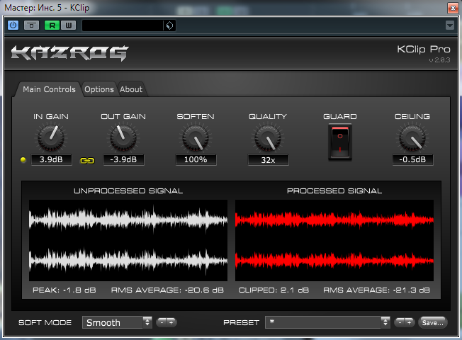 Это да... Спасибо... Но как конкретно вы его настраиваете? Линкуете IN и OUT и поднимаете IN пока не срежется 2 дб., или OUT GAIN на нуле оставляете и только IN GAIN-ном добиваетесь среза пиков на пару дб.? Как его настроить, чтобы он только пики незаметно срезал и больше в звук никак не вмешивался?