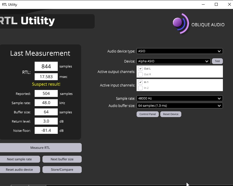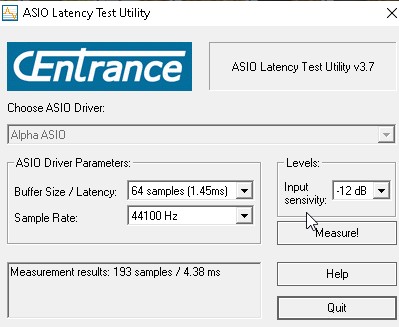 Alpha Asio - везде разные значения при тех же 64 семплах . Latency Test Utility = 4.38мс, RTL_Utility = 17.5мс, Cubase = 9.9 мс.