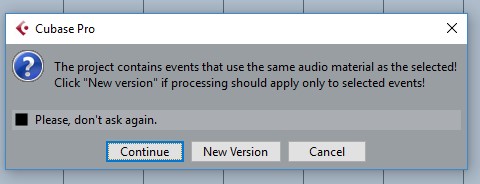 @Kostya, для подобной задачи вы, судя по амплитуде на фото, КМК слишком заморачиваетесь. Можно просто потянуть за хендл и добиться нужной громкости. Сколько там плюс или минус не имеет значения до тех пор, пока вы не слышите искажений. Если всё же хотите обработать, то "new version" создаст маленький файлик с обработанной областью. Без новой версии будет обработан весь файл целиком. Во всех использующих его фрагментах. В вашем случае следует выбрать "new version".