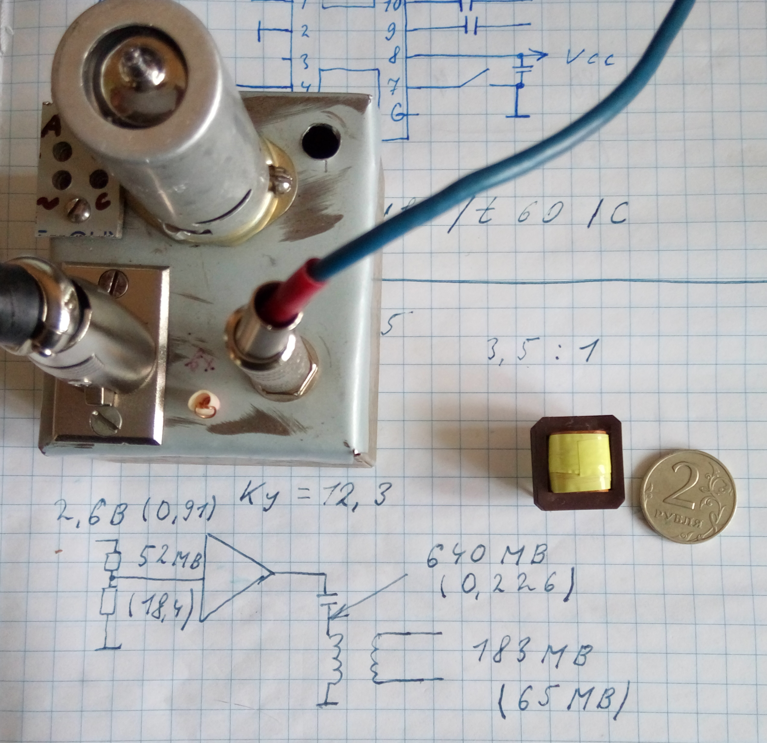 Проверил его в ламповом каскаде (такой же в самодельном микрофоне). Сигнал 18,4 мВ (RMS) на сетку лампы подавал через конденсатор в 100 пФ. Выходное сопротивление триода примерно 13-15 кОм. Ку примерно 12.3. На первичную обмотку попадает 0.226 В (RMS). Коэф трансформации 3.5: 1. На выходе примерно 50-60 мВ ( с учётом rin 1.5 кОм)