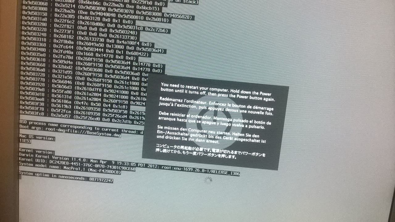 Словил проблему несовместимости осей при перепрошивке, потом поделил хард для установки 10.7 и начались непонятки с ошибками по типу тех что на фото. Потом снес капитана и начисто поставил 10.7.4. Удачно перепрошился. Поработало нормально какое-то время все. Думаю дай-ка займусь видеокартой. Не успел. Начались частые ошибки те что на фото. Что делать?