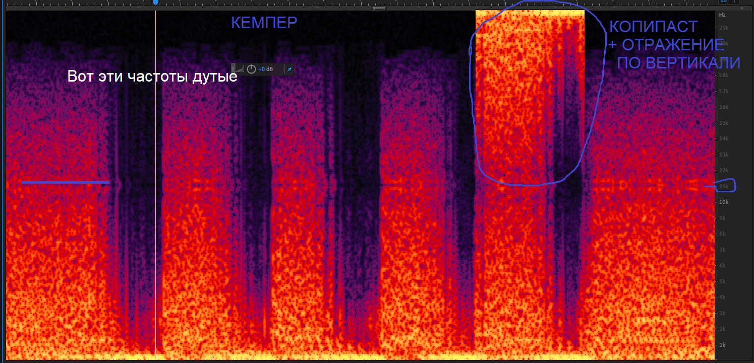 То и значит, происходит клонирование уже существующего контента в диапазоне от 0 до 11кГц до от 11кГц до самых 22кГц. Как если бы ты рисовал в школе бабочку, т.е. рисуешь акварелью только одну сторону, затем сминаешь лист по той линии, где будет проходить симметрия и одна сторона бабочки отпечатывается по сторону линии симметрии, но в отраженном виде.