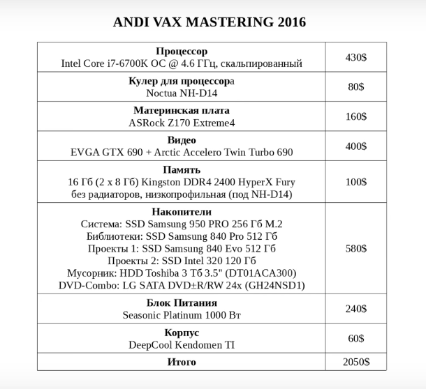 Всем привет товарищи музыканты.У меня тоже такой вопрос,по сборке системника.Посмотрев ролик от Энди вакса по сборке компа,решил собрать как у него компьютер.Но с деньгами туговато оказалось,и вот я решил что-то похожее собрать.Сам я в комплектующих,ну совсем чайник.Ну,это будет мой первый комп.Посмотрев скрин, можете дать дельный совет?По процессорам ,может купить другой проц?который лучше покажет себя при работе, чтобы зря деньги не тратить.А они для меня не маленькие. Комп собираю для написания музыки,сведения, итд,чтобы все работало стабильно.Благодарю заранее за отзыв!