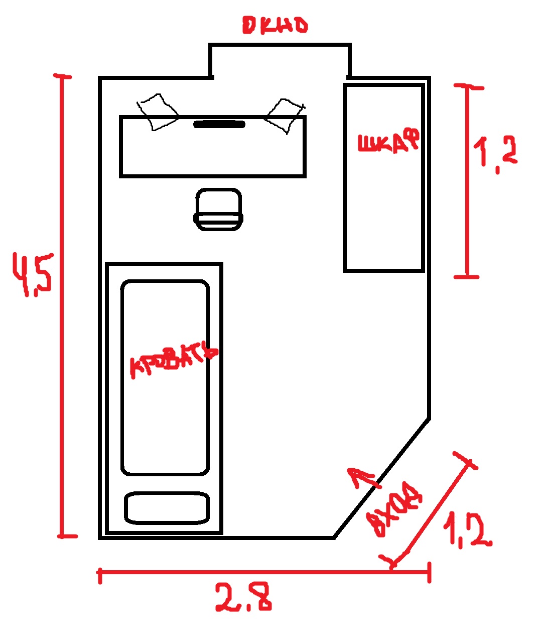 Комната сверхмалая 2.5м. х 3 м. высота 2.7 м (до этого размеры думал больше)
