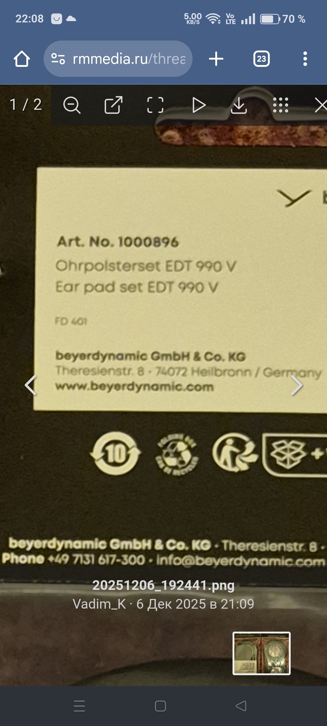 Т.е. то,что с этим парт номером амбушюры с поролоновым дисками продавались более 30 лет не смущало никого,а тут вдруг смутило. Если серьезно,то похоже,что с появлением 990 pro X амбушюры с поролоновым дисками сняли с производства,заметив их аналогичными без дисков(естественно с другими парт номерами). По крайней мере на немецком и американском сайте Баеров больше нет edt990 с дисками...ни черных,ни серых. Раньше только с дисками продавались,без вариантов.@Олег_авито, но обе позиции EDT 990 V, но у них отличаются парт-номера и EAN. Вот как так можно ? На сайте баеров только без прокладок 1000896, а с прокладками 926679 (что по линку выше на английский магаз) - больше в интернетах нигде не вижу таких и сомнения именно по 926679 .