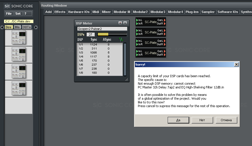 Ревербераторами на DSP платформы Sonic Core Scope лучше вообще не пользоваться, как я понял, так как мне объясняли что алгоритмы любого ревербератора работают с памятью для моделирования ранних отражений и хвоста, и для качественного моделирования этой памяти должно хватать, и при этом к ней должен быть быстрый доступ, но платформа Scope обращается для этих целей к оперативной памяти компьютера через шину PCI, которая и так перегружена её работой со звуковыми потоками, и от этого либо ревербераторы звучат некачественно, либо с более-менее лучшими по качеству ревербераторами на этой DSP платформе возникают проблемы, связанные с шиной PCI.